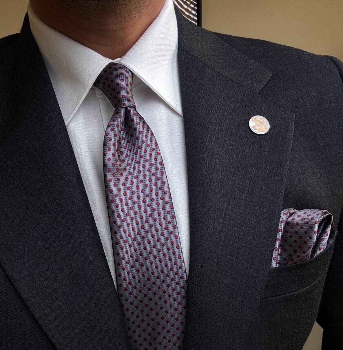 Gray with Burgundy Dots Tie – 7 cm – With Pocket Square
