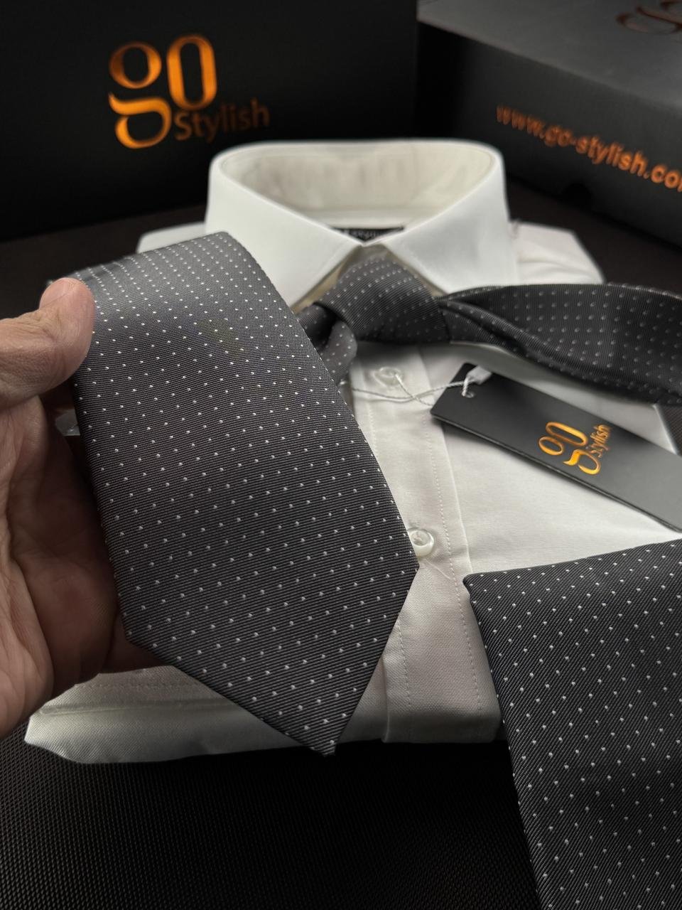 Be the first to review “Gray Mini White Dots Tie – 8 cm – With Pocket Square”